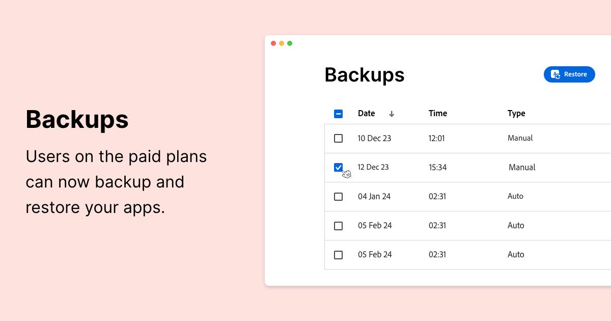 Users who are on a paid tier can now back up apps and roll back to different snapshots.