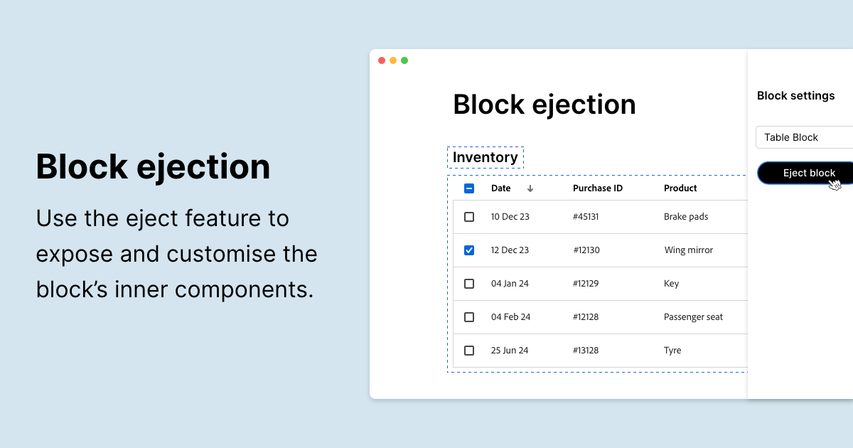 Blocks are an important and popular part of the design flow within Budibase. They simplify and speed up the design process. But, their opinionated approach can lead to roadblocks - until now. When using a block, if you hit a roadblock, you can now eject the block, and its inner components will become independently available to customize.